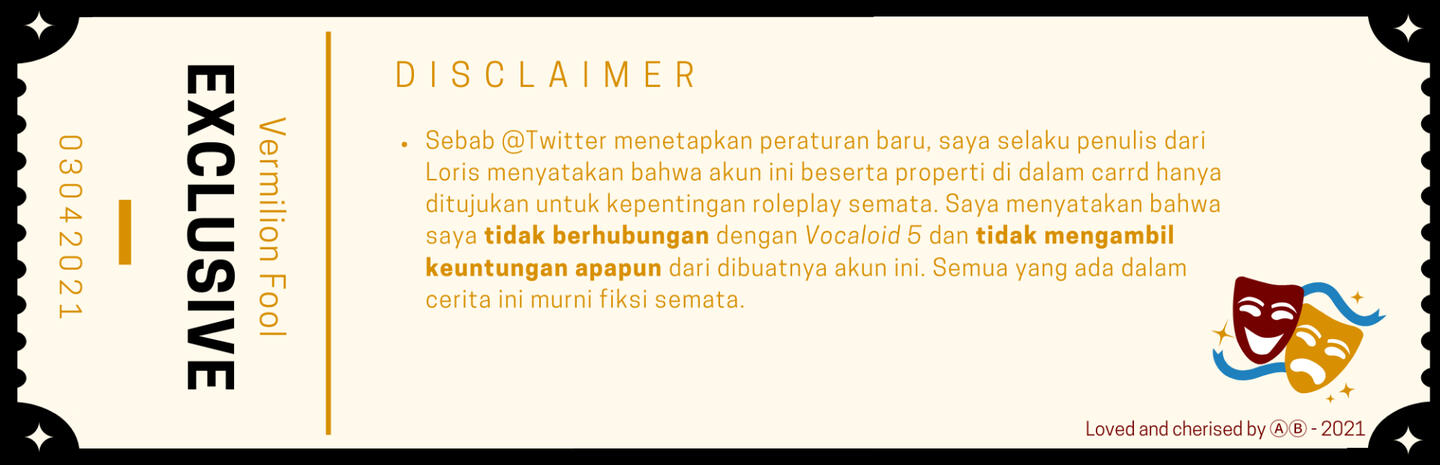 ㅤㅤㅤPunya nama terang(1) tetapi diabaikan, yang tahu cuma satu, dua, bisa dihitung jari. Yang tak mengenal menyebut Red Clown, yang akrab memanggilnya Loris. Lahir sebagai Gemini, 3 hari menjelang bulan ke-enam(2). Perawakannya sedikit lebih tinggi dari perempuan, tetapi sedikit lebih pendek daripada lelaki pada umumnya(3). Tidak kurus, tidak pula gemuk, hanya pas(4). Golongan darahnya dua abjad pertama(5). Punya sepasang kelereng berwarna merah cerah, satu punya luka, satu cuma biasa. Rambutnya nyala, entah warna api atau warna darah, tetapi pekat dan lebat. Kalau ditanya umur, ia kunci bibirnya, entah rahasia atau cuma tidak mau jawab.
